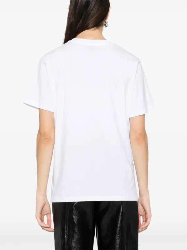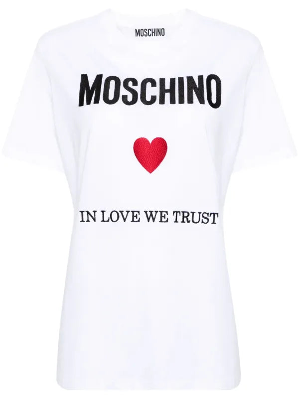 Moschino infuses affectionate spirit into a wardrobe staple with this white T-shirt. Made from cotton jersey to a simple crew-neck silhouette, it is decorated with logo and 'In Love We Trust' embroidery to the front, lending a hopeful, sentimental touch.