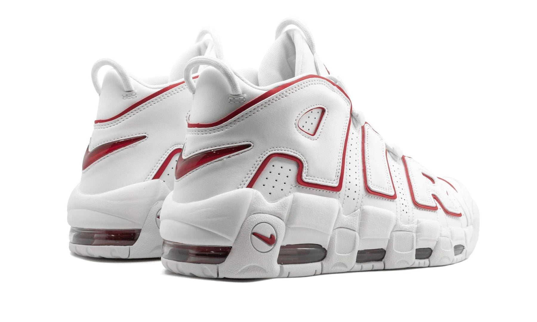 Nike Air More Uptempo '96 France QS sneakers in white and red. Part of the 'International' pack, this 1990's classic touches down in Paris and pays homage to our cultural friends with an embroidered French shape design to the heel. These white leather Air More Uptempo '96 feature a signature Nike swoosh and a front lace up fastening.