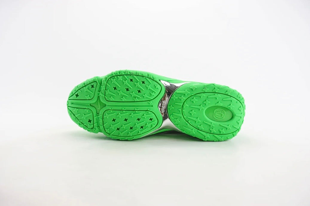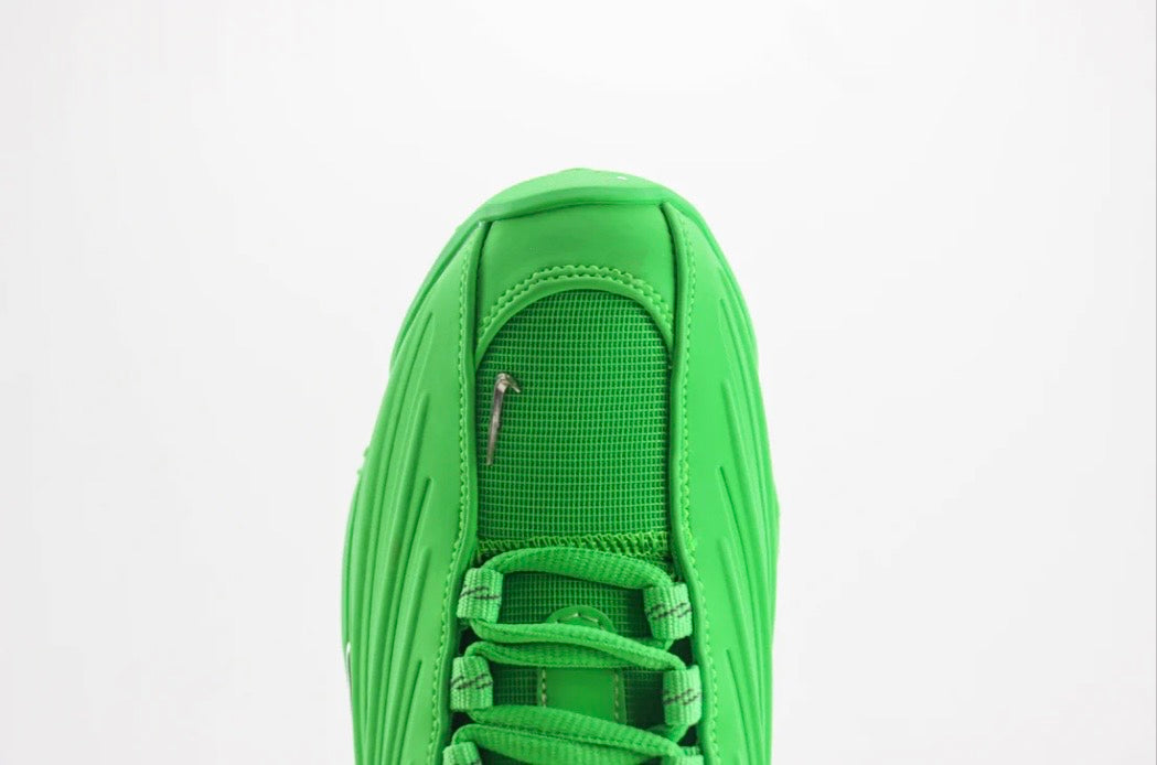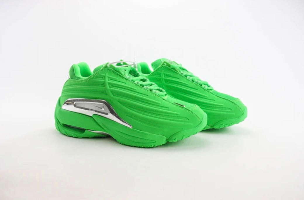 The latest sneaker of Drake and his NOCTA sub-line, the Hot Step 2, stands out for its vibrant 'total green' colourway. Created in collaboration with Nike footwear, this model is inspired by the 1990s turf trainer look with molded uppers and exterior metallics sitting above a newly crafted outsole featuring visible Zoom Air.