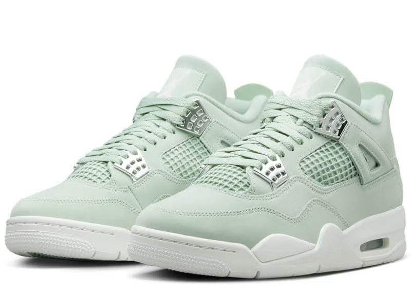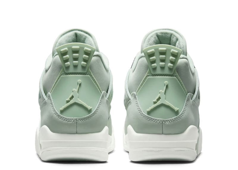 The Women’s Air Jordan 4 Retro ‘Seafoam Sail’ sports a pale green leather upper, tooled with the iconic quarter panel netting. A matching Jumpman logo adorns the tongue tag and heel tab. This monochromatic design is disrupted by metallic silver molded eyelets. An off-white foam midsole pairs with an Air-sole unit nestled in the heel.